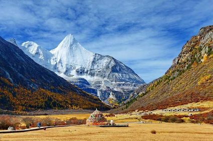 尤其亞丁匯集了稻城秋天所有濃烈的顏色:純凈的藍天,飛過白云間的蒼鷹,風格獨特的藏鄉(xiāng)建筑,金黃的秋楊,深紅的沼澤,波光粼粼的小河,多么美的一幅油畫,是人們歸隱田園的夢想天堂。