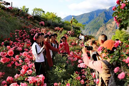 近日,丹巴縣甲居藏寨則姆花園20余畝玫瑰花競(jìng)相綻放,美不勝收。漫步其中,曲徑通幽,遠(yuǎn)處的墨爾多神山巍然聳立,山下的金川河奔騰高歌,四周的藏寨田園錯(cuò)落有致,眼前的四季玫瑰驕艷似火,吸引了不少游人前來(lái)賞花、拍照、打卡,好一幅怡然自得的山水田園畫(huà)卷。