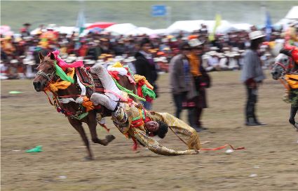 近日,在理塘縣奔戈鄉(xiāng)薩戈村八一賽馬場,來自全縣各鄉(xiāng)鎮(zhèn)近千名牧民進行了傳統(tǒng)的馬術表演,他們以高超的騎術展演了拾哈達、馬上射擊、馬上射箭、鐙里藏身、五彩凌空等馬術技巧,把歡樂帶到草原,讓當?shù)啬撩窈捅姸嘤慰拖硎芰艘粓鲆曈X盛宴。