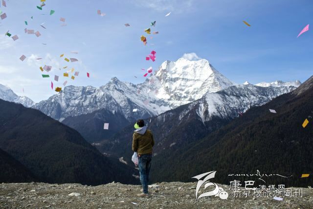 在車(chē)上,他很沉默,但當(dāng)車(chē)停靠在亞丁村口的觀景臺(tái)前時(shí),他下了車(chē),從懷里掏出一大疊小紙片,揚(yáng)手撒出,神色虔誠(chéng)。