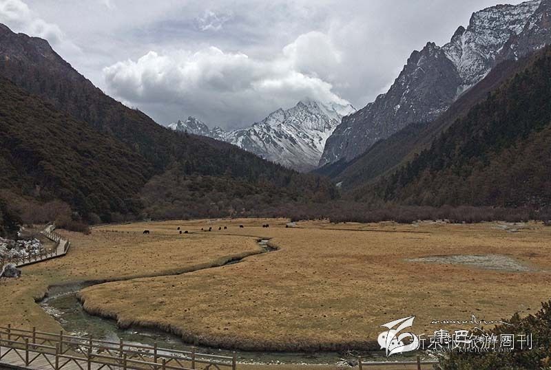 大概20分鐘左右的車(chē)程,我們到了洛絨牛場(chǎng)。這是一個(gè)被雪山環(huán)繞的草甸,仙乃日、央邁勇和夏郎多吉三座6000米的雪峰呈“品”字形分別位于西北、東南和東面,雪峰之間,形成了一片長(zhǎng)寬約5公里的高原寬谷。