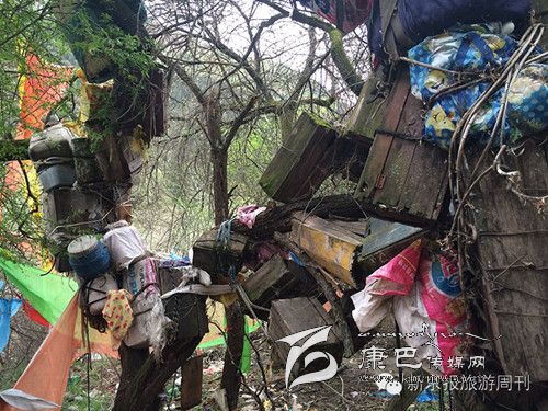 樹葬大都是13歲以下的未成年人。一般家庭幼兒死亡率高的就把木箱掛在高處,女嬰死后一般掛在最下端,有的則將尸體火化后裝入泥罐內(nèi)再懸掛在杉樹上。