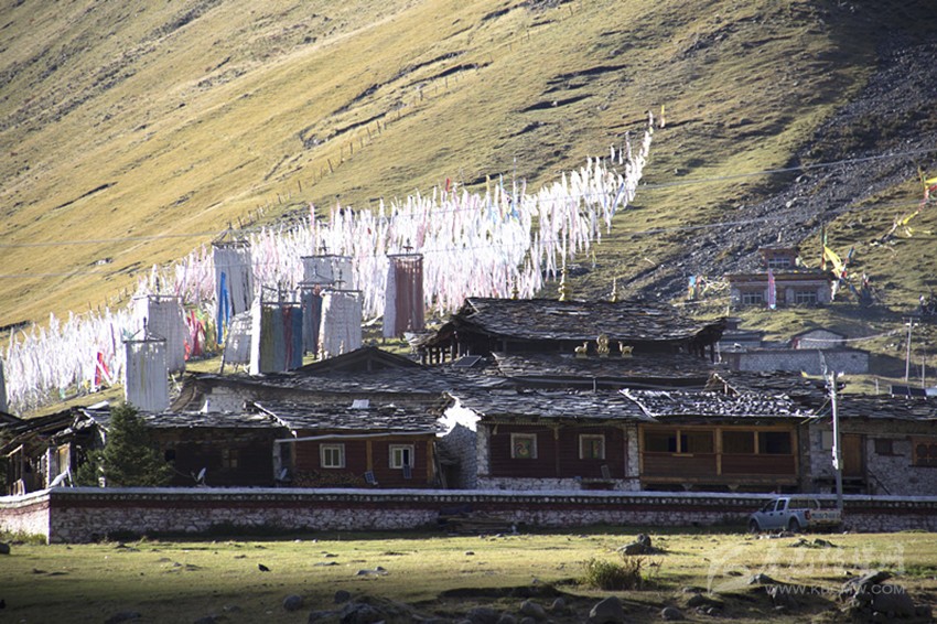 當(dāng)太陽落進(jìn)金龍雪山的懷抱,最后一抹余暉斜照在靜靜的莫斯卡村莊上。東邊的小河在斜陽里歡快的流過村莊,莫斯卡的女人在夕陽里,正領(lǐng)著孩子回家。西邊牧歸的男人悠閑的向山下趕著牦牛。村莊背后漫山的經(jīng)幡,在晚風(fēng)里誦經(jīng)祈?!袼_爾王的傳說就在這樣的時(shí)光里,雕琢成了漫山的石刻,在經(jīng)年的歲月里傳頌。