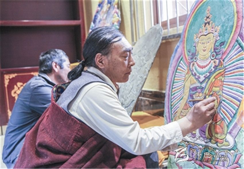 從子承父業(yè)再到吸眾家之長,自離開故鄉(xiāng)的那天起,巴德的視野開始變得開闊起來。1979年到省藏校學(xué)習(xí)藏文和美術(shù),并開始涉獵泥塑技藝,隨后又向德格民間藝人扎西澤郎學(xué)習(xí)彩繪石刻,然后又到西藏、甘肅等地學(xué)習(xí)繪畫、石刻技藝。巴德說,自己之所以有今天的藝術(shù)造詣,是因?yàn)橛幸慌麕熤更c(diǎn),是因?yàn)樽约旱牟粩嗵剿骱烷L期堅守。讓他欣慰的是,自己的三個兒子都在學(xué)習(xí)石刻和繪畫,親戚朋友中的十多個孩子也成了他的入門弟子。