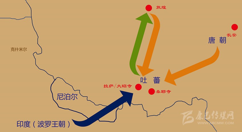 吐蕃贊普朗達瑪遇刺,藏傳佛教在吐蕃復(fù)興,歷史學(xué)家稱之為“后弘期”。后弘期有“上路弘法”和“下路弘法”兩次佛教傳入西藏的運動。在“上路弘法”的過程中,犍陀羅藝術(shù)被帶到了拉達克、古格,也帶進了衛(wèi)藏地區(qū)。而“下路弘法”則把漢地的繪畫風(fēng)格再次帶到了衛(wèi)藏地區(qū)的扎塘寺等地。