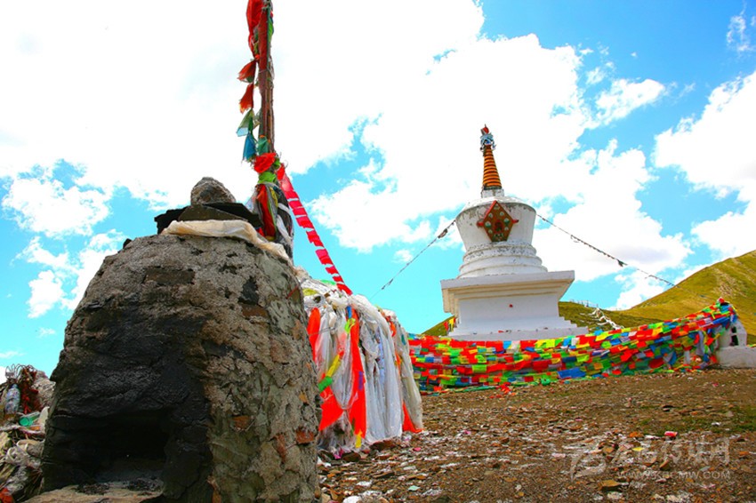 藏族幾乎全民信仰藏傳佛教。折多山上下四周,山頂河谷到處飄揚著五色經(jīng)幡,或者印以文字,或者繪以圖案。經(jīng)幡五色,依次是藍、白、紅、綠、黃,藍色象征藍天,白色象征白云,紅色象征火焰,綠色象征綠水,黃色象征大地。五種顏色代表生命賴以存在的基礎(chǔ)。世代生活在高原上的人們對大自然的變化尤其敏感,故企盼大自然風(fēng)調(diào)雨順,人間太平幸福。佛教慰藉了他們的靈魂,經(jīng)幡寄托了他們的希望。