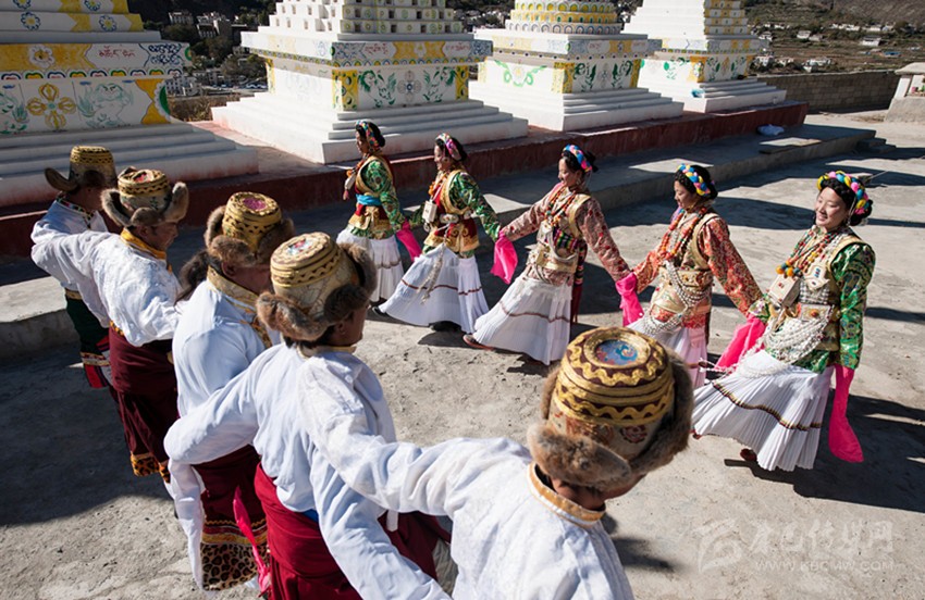這當中最具有依憑的觀點是:“學羌”是藏族傳說人物江根阿坡創(chuàng)作的,他綜合了康巴三江沿岸的鍋莊與踏歌的舞步,又融入了滇西北少數民族的一些舞蹈元素。從歷史上看,得榮瓦卡(茶馬古道金沙江碼頭)曾是茶馬古道上的一座重鎮(zhèn),各民族的馬幫和商人曾集聚在瓦卡碼頭?;蛟S,人們常常在這里載歌載舞,久而久之,在碰撞和交流中慢慢融合出了一個新的舞蹈:學羌。