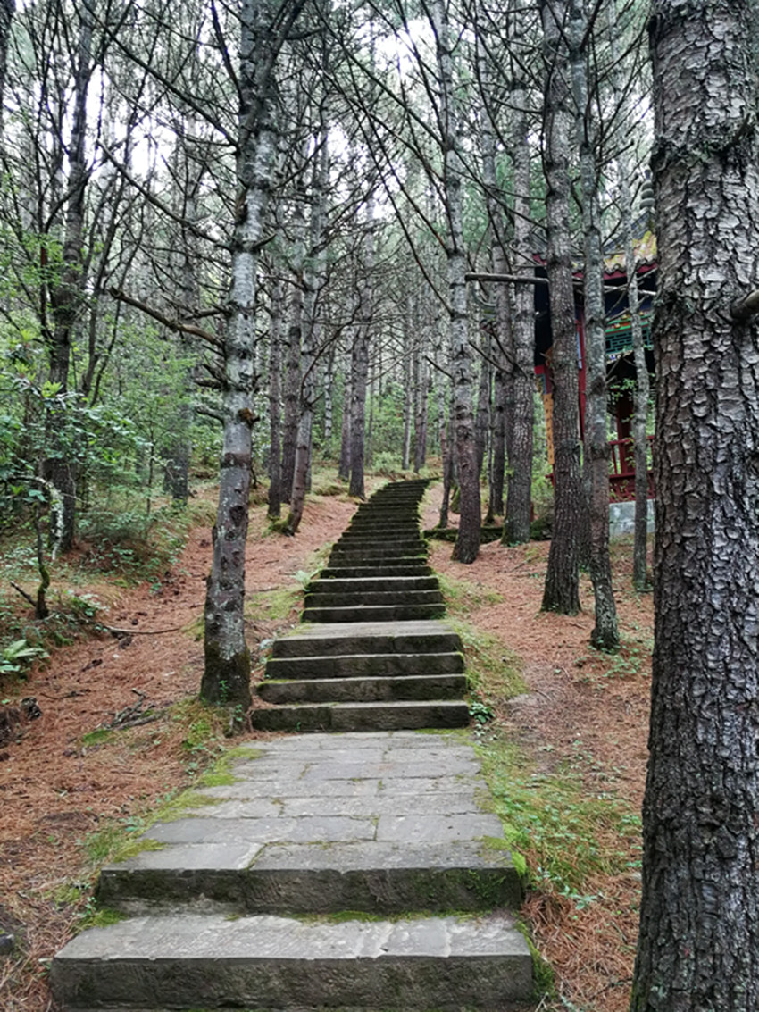 如今多年沒(méi)見(jiàn)到過(guò)石燕了。封山育林后,跑馬山白楊和松林已是茂密葳蕤,四道巖仍在萬(wàn)綠叢中屹然而立。由山腰長(zhǎng)廊有小徑直達(dá)四道巖頭。巖頂上彩幡獵獵,隨風(fēng)作響,有回欄瞭棚立于巖頭,城區(qū)容貌盡收眼底。原來(lái)是康定城里幾個(gè)與我差不多同時(shí)代的人在此“心歸佛塵”。觀山望景人時(shí)有之,喝茶閑棋之人亦有之,四道巖竟成康定一民間打造絕佳景點(diǎn)。只是這“四道巖”的稱謂鮮有人提起。