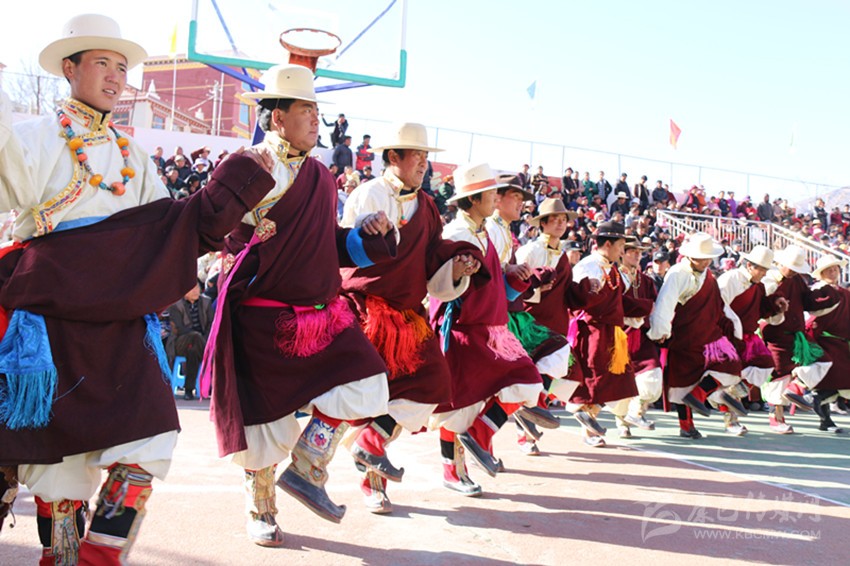 弦子比賽開(kāi)始了。精神矍鑠,頭戴紅須“嗦啊”的扎西第一個(gè)出場(chǎng)。白色“仙子”(藏式襯衫)的長(zhǎng)袖一層層疊到手腕,藍(lán)緞子藏式背心在陽(yáng)光的映襯下,顯得格外光亮耀眼。一把彩色弦胡抵在左腰,左手幾個(gè)指姆在馬尾琴弦上靈動(dòng)地起落按擦,右手輕松自如地拉動(dòng)琴弓,琴弦伸縮間,琴筒里發(fā)出悠揚(yáng)的弦子聲。他扯開(kāi)嗓子起音,聲音宏亮,身后十一個(gè)胡琴手齊拉共唱,后面一百多位著盛裝的男女舞者動(dòng)作整齊劃一,一個(gè)回環(huán)往復(fù)的圓圈逐漸形成,原生態(tài)歌聲化漾開(kāi)去,從廣場(chǎng)的四面八方升騰起來(lái),在天際飄蕩: