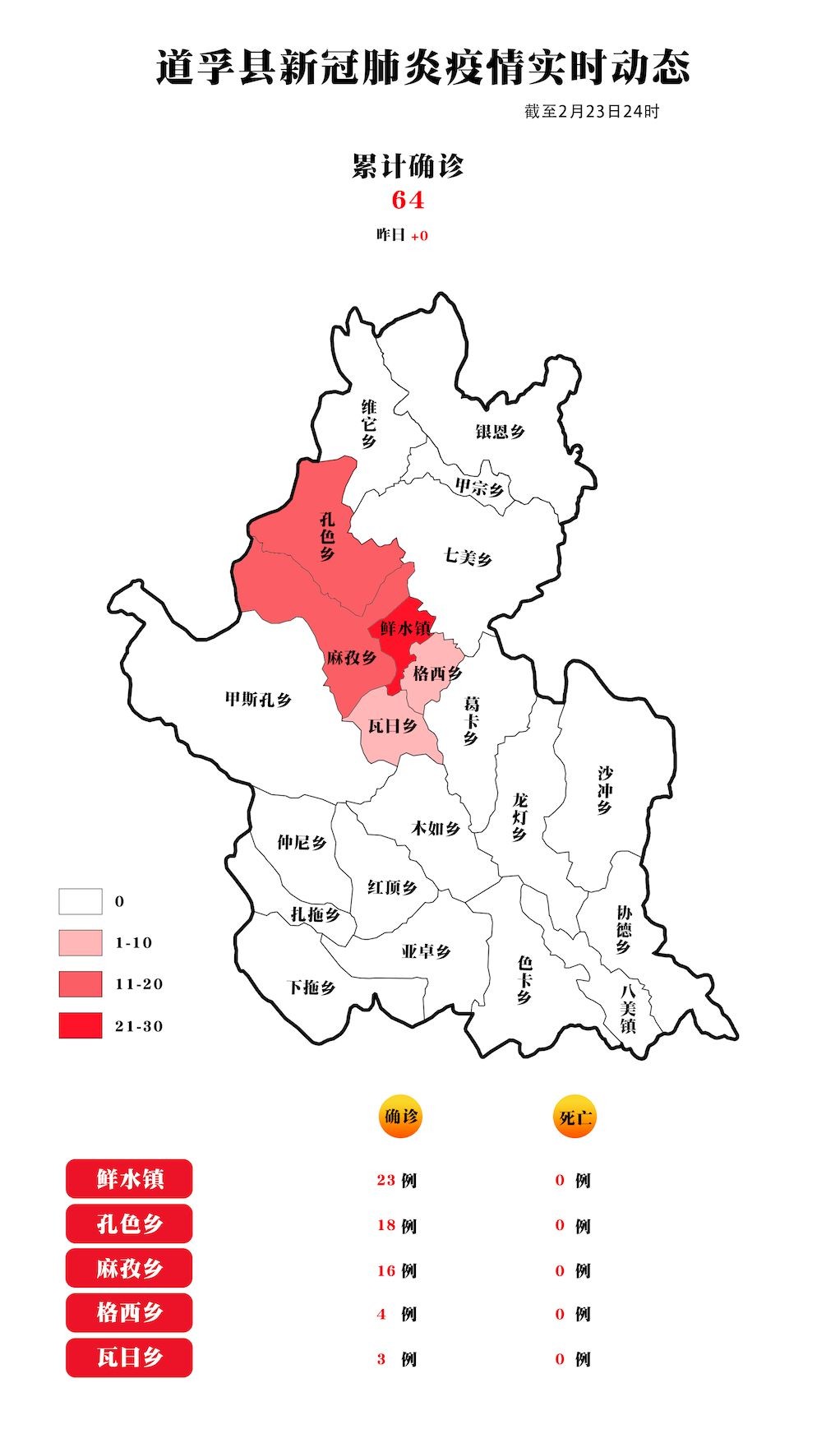 各縣(市)確診病例情況表 疫情實(shí)時(shí)追蹤 (截至2020年2月23日24時(shí)) 四川省各市(州)確診病例情況表 (截至2020年2月24日0時(shí)) 市(州) 確診病例 治愈 出院 病例 累計(jì) 新增 2月23日0-24時(shí) 成都 143 0 78 自貢 9 0 7 攀枝花 16 0 16 瀘州 24 0 8 德陽(yáng) 18 0 7 綿陽(yáng) 22 0 12 廣元 6 0 6 遂寧 17 0 10 內(nèi)江 22 0 11 樂山 3 0 2 南充 39 1 22 宜賓 12 0 8 廣安 30 0 20 達(dá)州 41 0 13 巴中 24 0 10 雅安 7 0 4 眉山 8 0 6 資陽(yáng) 3 0 2 阿壩 1 0 1 甘孜 69 0 12 涼山 13 0 8縣(市) 累計(jì)病例 新增病例 道孚縣 64 0 康定市 2 0 色達(dá)縣 2 0 稻城縣 1 0