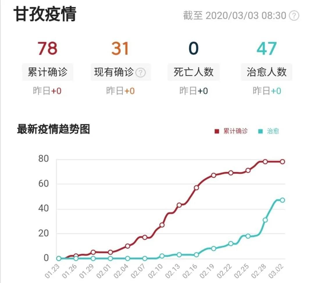 截至3月2日24時(shí),我州累計(jì)報(bào)告確診病例78例,累計(jì)治愈出院47人(道孚縣42人、康定市2人、色達(dá)縣2人、稻城縣1人),其余31人均在定點(diǎn)醫(yī)院隔離治療,203名密切接觸者正在接受醫(yī)學(xué)觀察。我州道孚縣連續(xù)4天無(wú)確診病例報(bào)告,其余17個(gè)縣(市)連續(xù)28天無(wú)確診病例