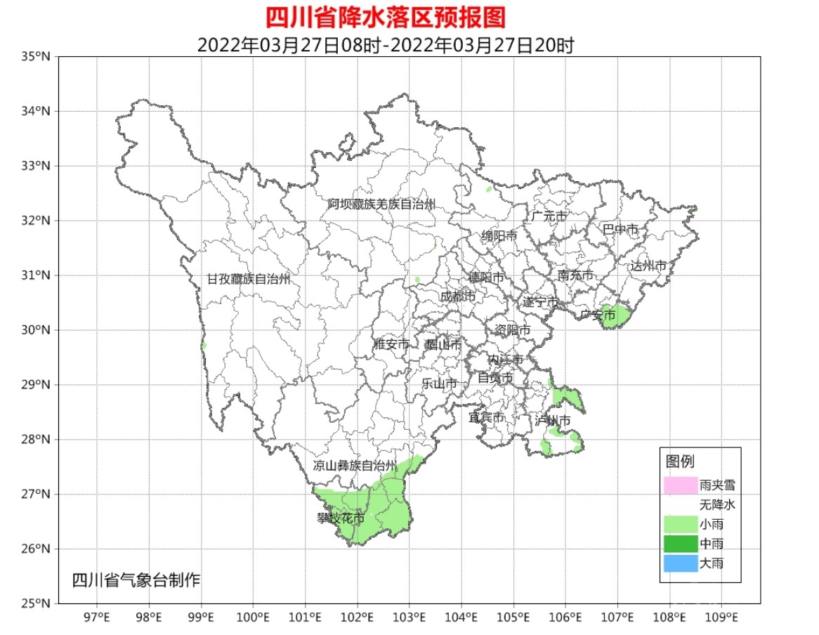 預(yù)計(jì)28~29日盆地大部多云,局部陣雨,川西高原和攀西地區(qū)晴間多云;30日~4月2日我省有一次降溫、降水天氣過(guò)程,其中盆地大部和攀西地區(qū)及川西高原東部南部有小到中雨,局部大雨。