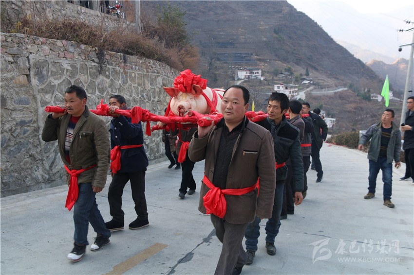 5個(gè)村民將年豬抬到秤上。360斤。村民為年豬準(zhǔn)備大紅花。準(zhǔn)備紙錢(qián)、香蠟。9點(diǎn)整,殺豬匠開(kāi)始了他的工作,在眾人齊心協(xié)力下,光溜溜的年豬被打整干凈?!氨S游覀兇鍋?lái)年風(fēng)調(diào)雨順、五谷豐登,村民平安健康?!贝逯欣险呔催^(guò)天地后,8個(gè)身強(qiáng)力壯的村民站在年豬旁,豎著拇指齊聲說(shuō),今年家家戶戶還要養(yǎng)大肥豬。抬著年豬,村里的中老年人簇?fù)碇咴谧钋懊?,唱著悅耳的民謠,大意是歌唱幸福生活的,迎著2018年的第一縷陽(yáng)光,村民們喜氣洋洋。到村里來(lái)的游客蜂擁拍照。