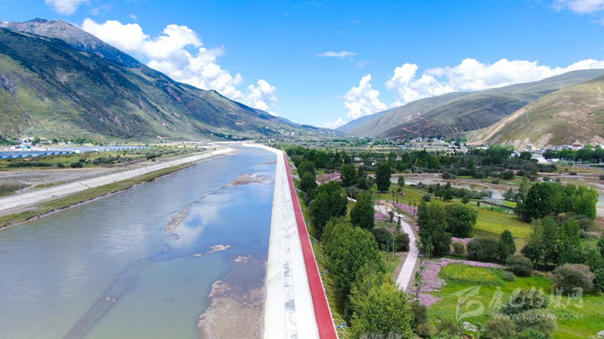 道孚縣實行的“以堤代路”綠化工程,以孜龍大橋為起點,鮮水河大橋為終點,全長2.412公里,沿途的一邊是奔流不息的鮮水河,另一側是正在建設的道塢濕地公園,不遠處種植的藏杏花正在悄然開放,鍛煉的間隙還能眺望雪山,走在其間感覺神清氣爽?!耙缘檀贰本G化工程的路面是富有彈性的膠粘石路,它能迅速把降水滲入地下,起到了維護生態(tài)平衡的作用,同時路面還不易積雪,也保障了行走安全。