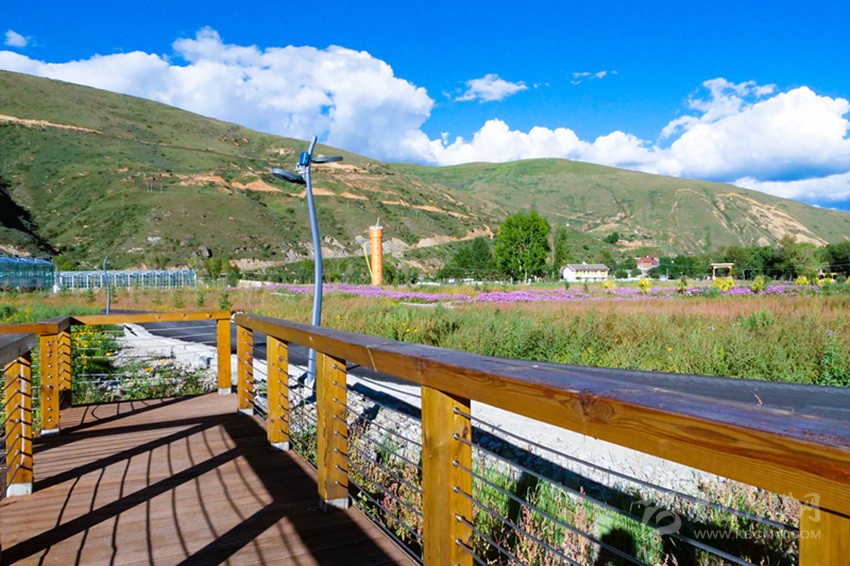 陽光下,成片開放的波斯菊搖曳生姿,成片白楊林包圍著12個16—25平方米不等的仿道孚民居外觀的樹屋,沿著鵝卵石鋪設、牡丹點綴的棧道漫步,兩側種植著落葉松、金葉垂榆、康定木蘭、五小葉槭等32種具有高原特色的植物,樹下種植以虞美人、百葉菊等17種花卉為主的草本植物;來到湖心島,不少人坐在其間休閑,有的坐在樹下乘涼,有的坐在溪邊聊天,還有不少人在伸臂橋上照相,不遠處透明的玻璃溫室展覽館已經(jīng)完成建設,走過開滿桃花的拱形門,陽光灑在地面上讓人心生暖意,廢棄的水塔變成了打酥油茶用的醬桶,山、水、溪、樹、花、屋構成了不同意境的高原園林景觀。