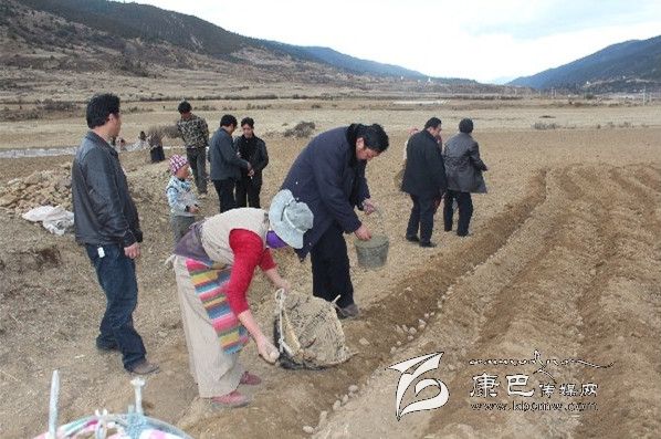 在格中村的田間地頭,到處是一片忙碌的春播景象。雷建平走進斯朗卓瑪?shù)奶镩g,在農(nóng)業(yè)技術(shù)人員的指導下,從選種開始學起,病害的種丟掉、大的切成幾瓣,撒點底肥,均勻丟種,把蓋種的土弄成一個梯形的壟。雷建平一邊勞動,一邊和斯朗卓瑪攀談,去年土豆收成怎樣?有沒有增加收入?今年春耕生產(chǎn)有哪些實際困難?雷建平又接著向她推薦用地膜種土豆的好處,蓋不蓋膜大不一樣,1畝要多收500-1000公斤,加上上市早,價格也要貴一些,可以到臨近的甲洼鄉(xiāng)江達村去學習經(jīng)驗。