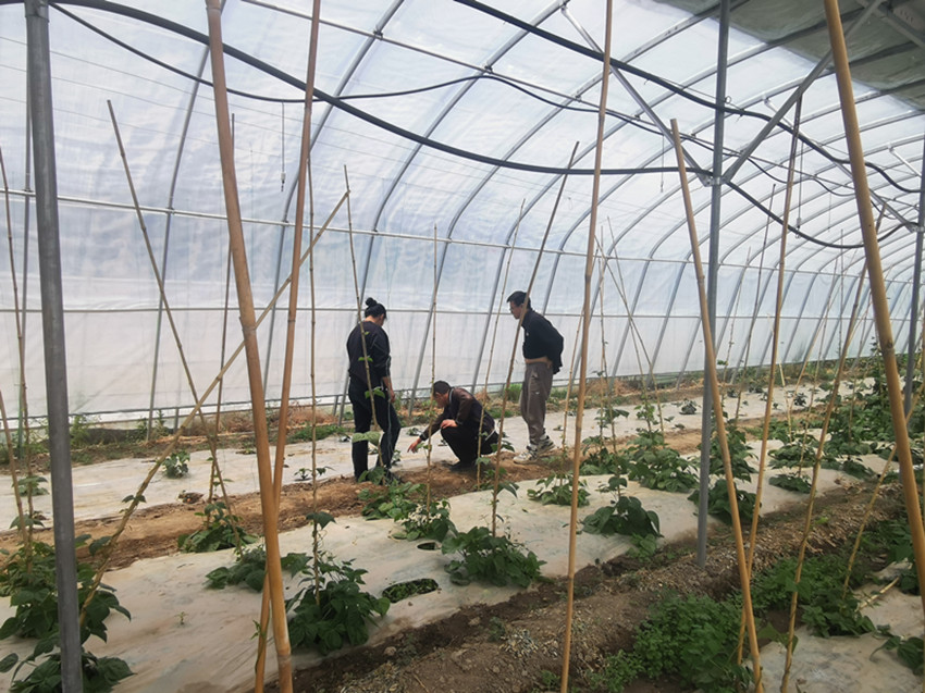 農(nóng)技員在蔬菜大棚指導農(nóng)戶進行科學管護。