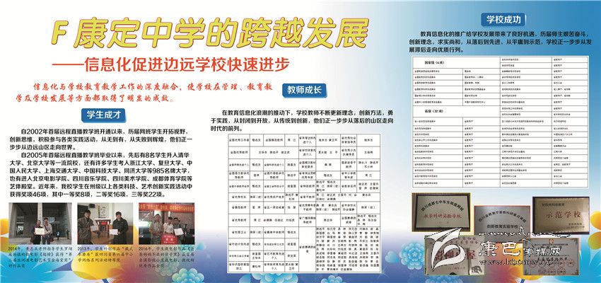 2002年以來康定中學(xué)立足民族地區(qū)教育實(shí)際,依托成都七中優(yōu)質(zhì)教育,先后開通成都七中高中直播班、初中錄播班,建成初中遠(yuǎn)程直錄播教學(xué)AB平臺,實(shí)現(xiàn)了與國內(nèi)名校共享優(yōu)質(zhì)教學(xué)資源的目標(biāo),將網(wǎng)課教學(xué)打造成學(xué)校教育品牌。經(jīng)過近5000名師生員工的不懈努力,2013年來,康定中學(xué)連續(xù)4年高考硬上本科人數(shù)突破200人大關(guān)。先后有8名學(xué)生被北京大學(xué)和清華大學(xué)錄取。中考綜合評比連續(xù)9年保持全州第一。