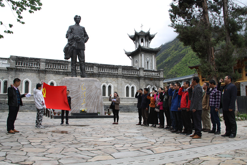 本網(wǎng)訊 (本網(wǎng)記者 秦松 攝影報道)日前,甘孜日報社全體黨員與群眾工作全覆蓋結(jié)對共建共創(chuàng)的海螺溝燕子溝鎮(zhèn)的躍進坪村支部、南門關(guān)村支部、麻柳林村支部、喇嘛溝村支部的黨員,懷著崇敬的心情來到磨西長征紀念館毛主席塑像前,舉行緬懷革命先烈、重溫入黨誓詞活動?;顒又?,黨員們還與共建共創(chuàng)支部黨員進行了座談。圖為宣誓活動現(xiàn)場。
