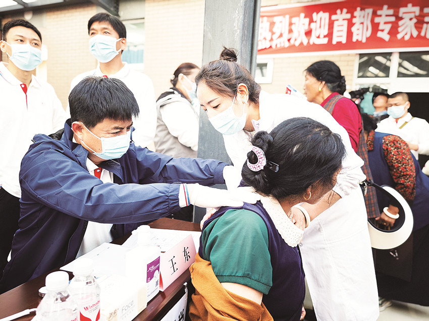 排隊、分診、診斷……在巴塘縣義診現(xiàn)場,每一位身著白衣、口音輕柔的醫(yī)生面前都有數(shù)名等待問診的群眾。來自北京大學第一醫(yī)院、解放軍第八醫(yī)學中心、北京航天總醫(yī)院等醫(yī)療機構(gòu),涵蓋腎臟、中醫(yī)、骨科、肝病科疾病等多個領(lǐng)域的專家團隊正為前來問診的群眾提供多學科專業(yè)義診服務(wù),并就常見疾病耐心細致地為患者及家屬答疑解惑。